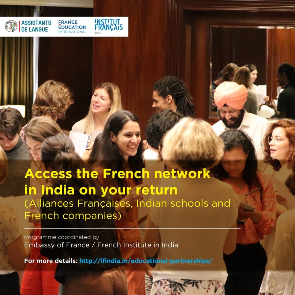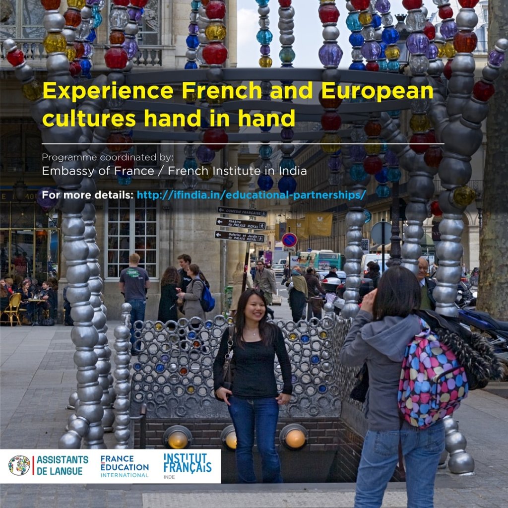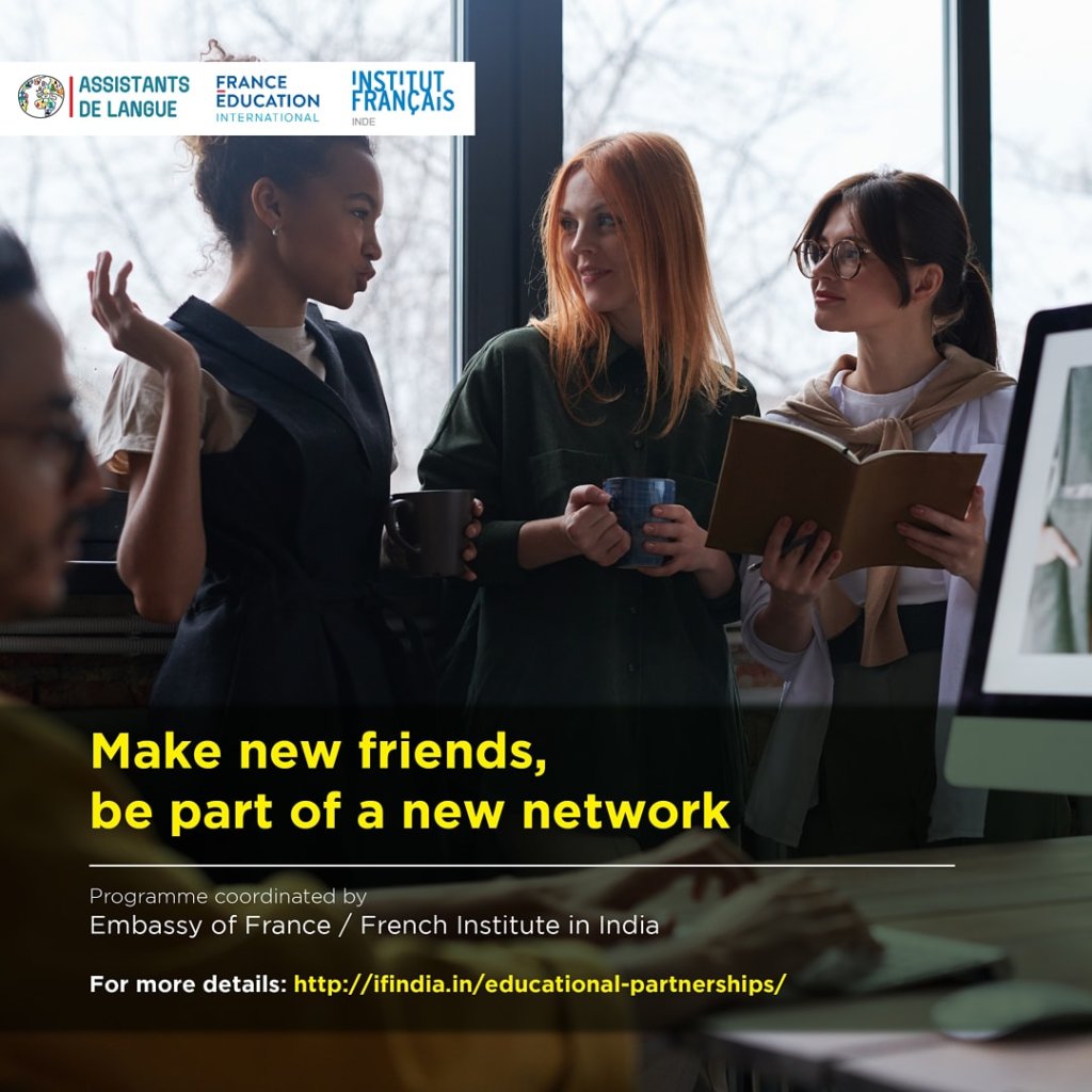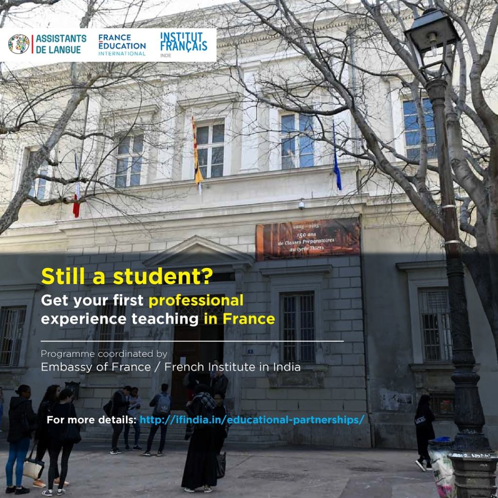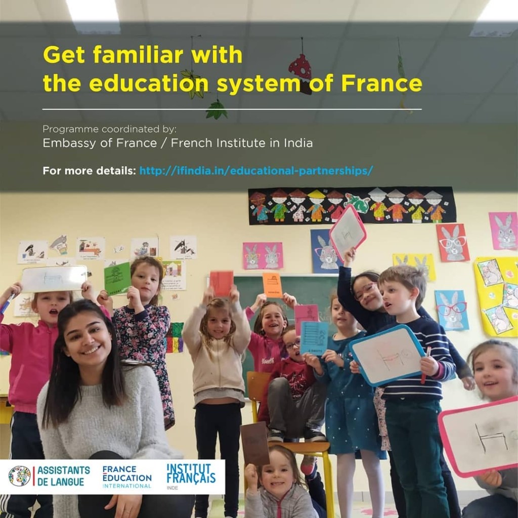 The program is known as Assistant de langue (Language Assistant) or TAPIF (Teaching Assistant Program in France) primarily in the US. In India, it is called Assistant d’anglais (English assistant program). Under this program, more than 150 Indian students are recruited to work as English-language assistant teachers in French public schools. The program enables these students from Indian universities or Alliances Françaises to become familiar with the French language and civilization, while bringing the authenticity of their language and the richness of their culture to the institutions where they are employed.